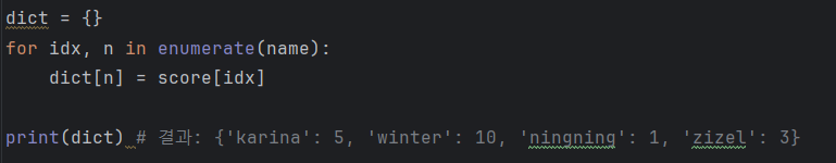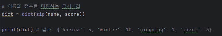 dict = dict(zip(name, score)) # 결과: {'karina': 5, 'winter': 10, 'ningning': 1, 'zizel': 3}
