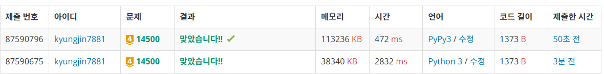 똑같은 코드인데도 Python3로 제출했을 때는 2832ms가 걸리던 것이, PyPy3로 제출했을 땐 472ms가 걸린 것을 본 나 ..