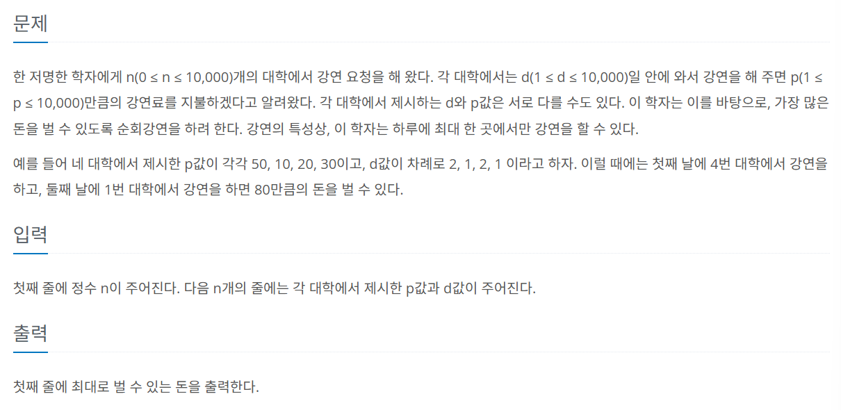 처음에 'd일 안에 와서 강연을 해 주면' 이 문장 때문에 문제 이해에 약간 시간을 썼다. 나와 비슷한 처지(?)에 있으신 분들에게 이해가 쉽도록 예시를 들어드리자면 .. 3개의 대학에서 아래와 같은 조건으로 강연 요청을 해 온 상황이라고 가정 해보자.