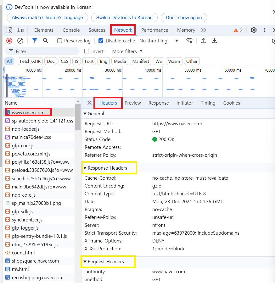 이렇게 개발자도구의 Network 탭에 가면 http 요청 메세지 헤더와 응답 메세지 헤더를 확인할 수 있다.