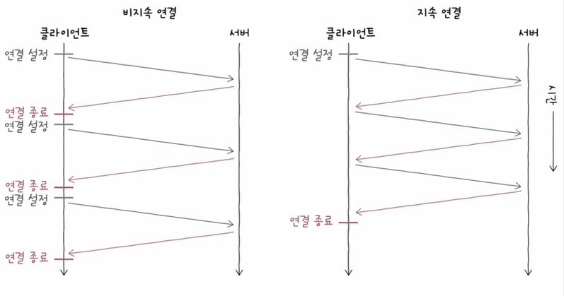 이런 비연결성의 단점을 극복하기 위해서 HTTP 지속 연결이 나왔다.