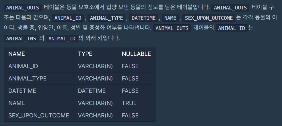ANIMAL_INS 테이블과 ANIMAL_OUTS 테이블이 주어지고, 여기서 보호소에 들어왔을 땐 중성화 되지 않았지만 나갈 땐 중성화 된 동물들의 아이디와 타입, 이름을 아이디 순으로 오름차순 정렬해서 조회하면 되는 문제였음