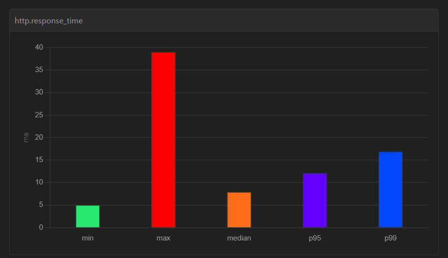 - http.response_time : 최소, 최대, 중앙값, 95번째 백분위수 및 99번째 백분위수 응답 시간을 포함한 HTTP 요청의 응답 시간에 대한 통계