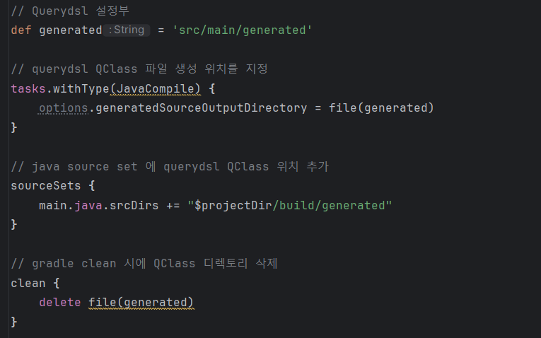 3. sourceSets에서 기존의 소스 코드 경로에 추가로 Q클래스가 생성되는 경로를 추가 :