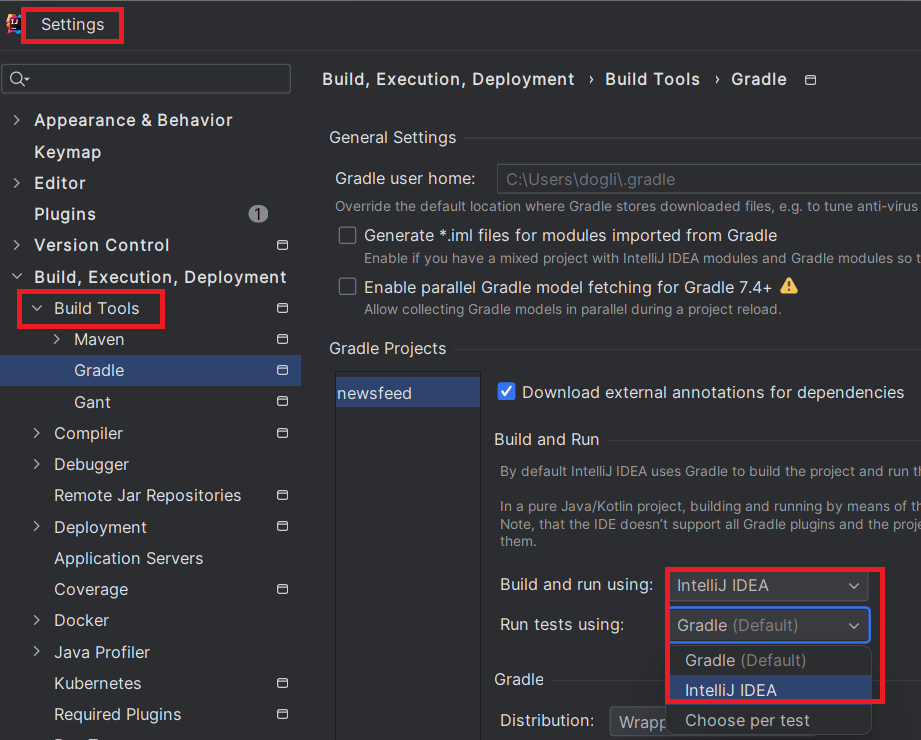 구글링 결과 빌드 방법을 바꾸고 해결하신 분들도 보여서 gradle 이었던 빌드 방식을 → IntelliJ IDEA 빌드로 바꿔서 다시 재시작 해보았는데도 import는 되지 않았다.