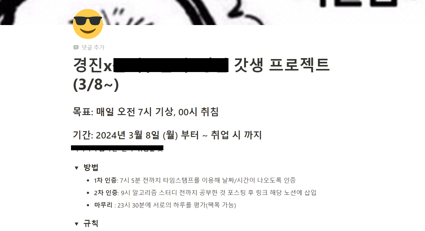 마음 맞는 분들과 프로젝트 기간 동안에도 알고리즘 감을 잃지 않기 위해 알고리즘 스터디를 진행하고 있고, 취준 기간 동안 생활 패턴을 위해 미라클 모닝 스터디도 진행 중이다.