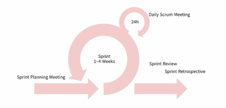 (전용집정존 으로 외웠ㅎ..) - 스프린트 플래닝 미팅 → 스프린트 진행 (보통 2, 3주)하며 1일 1 데일리 스크럼 미팅 → 스프린트 리뷰 → 스프린트 회고(Retro)