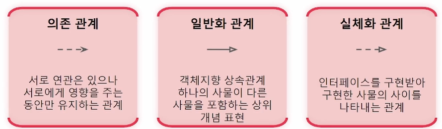 - 종류: 연관, 집합, 포함, 의존, 일반화, 실체화 관계