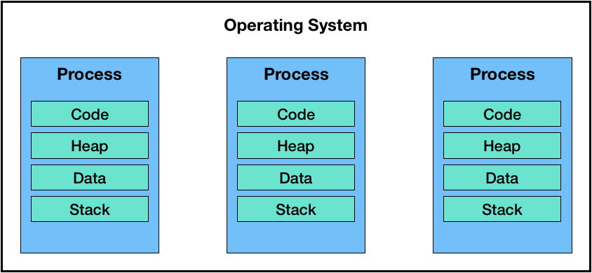 각 프로세스는 독립된 메모리 공간을 가지며, 자원 접근이 복잡하고 상대적으로 느리다.