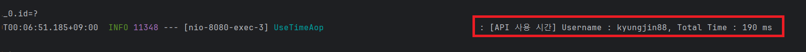 log.info("[API 사용 시간] Username : " + loginUser.getUsername() + ", Total Time : " + apiUseTime.getTotalTime() + " ms");