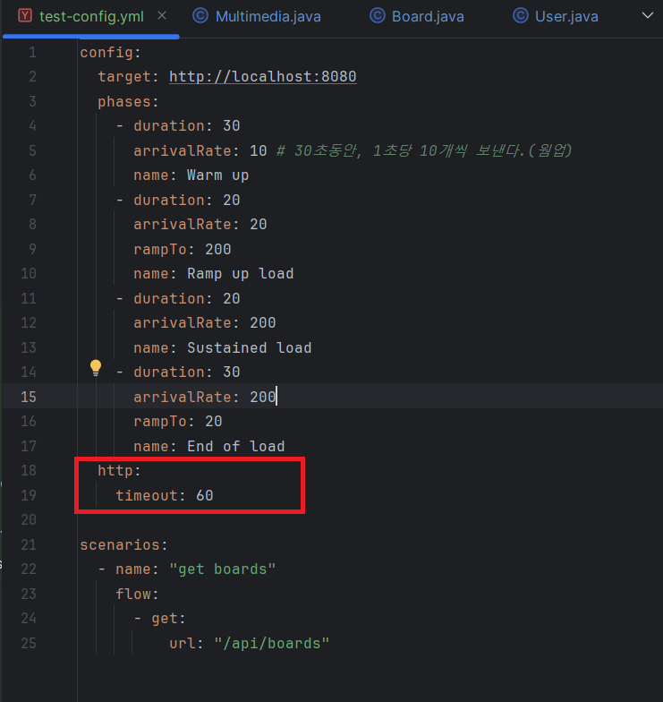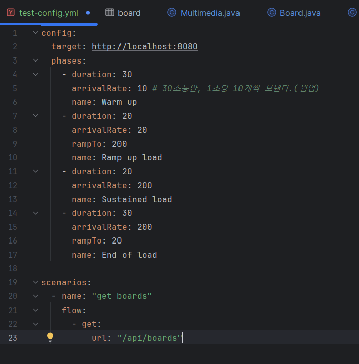 지난번 포스팅에서 테스트했던 test-config.yml 파일을 수정해줬다. 로컬에서 진행하기 위해서 URL은 그대로 로컬 서버로 지정해줬고, 테스트 구성은 아래와 같다.