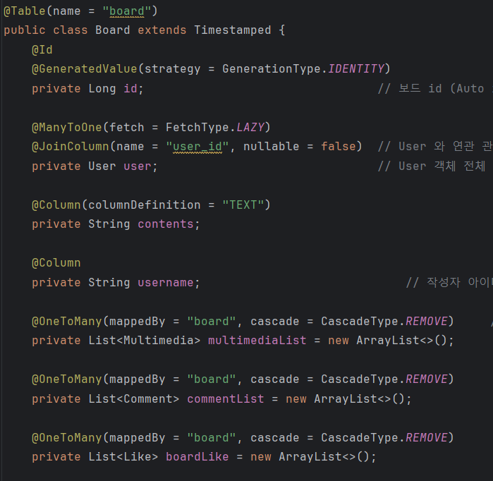 Board 엔티티 필드를 살펴보면, 게시글은 유저와 N:1 관계를 맺고 있고,