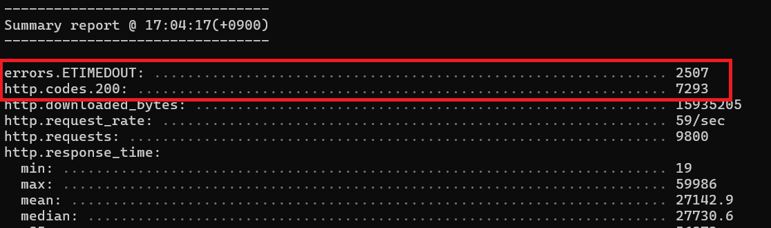 Artillery를 통해 쏜 거의 대부분의 요청이 errors.ETIMEDOUT 와 함께 실패했다.