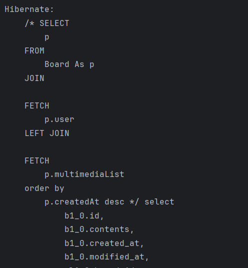 이렇게 해 본 결과, 에러 없이 기능은 잘 돌아가지만 근본적인 해결책은 아니라고 판단했다. multimedia는 용량이 크고 boardlike는 단순히 count로 숫자만 가져온다고 해도, 모든 게시글에 필수적으로 들어가 있는 요소이기 때문에 게시글마다 모두 조회를 해야한다.