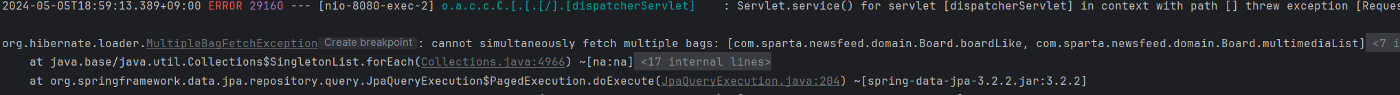 org.hibernate.loader.MultipleBagFetchException: cannot simultaneously fetch multiple bags: [cohttp://m.sparta.newsfeed.domain.Board.boardLike, cohttp://m.sparta.newsfeed.domain.Board.multimediaList] 라는 에러가 뜬다.