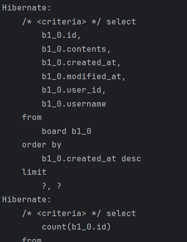 추가적으로 ManyToOne 관계인 User는 fetch join 전략을 써 줬고, OneToMany 관계인 경우에만 BatchSize 전략을 이용해줬다. 꺼 둔 sql 로깅 기능을 다시 키고 로그를 찍어보니 limit과 in을 활용해서 25개의 쿼리문에서 총 14개의 쿼리문으로 줄어듦을 확인할 수 있었다.