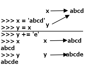 숫자형과 동일하다. 문자열 y에 'e' 를 추가하더라도 x에는 영향이 가지 않는다.