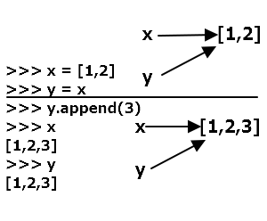 위의 숫자형, 문자열과는 다르다. 리스트 x, y가 있을 때, y에 3을 붙여주면 새로운 리스트가 복사되는 것이 아니라 해당 리스트를 수정한다.