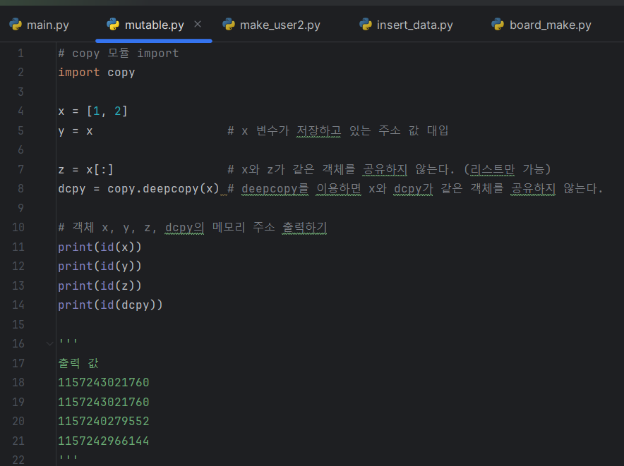 위 코드들을 보면, y = x 부분에서 y와 x가 같은 주소 값을 가리키고 있다. 이 때 리스트의 [:] (슬라이스)나 deepcopy 함수를 이용하면, 리스트의 복사본을 생성함으로써 같은 객체를 공유하지 않도록 설정할 수 있다.