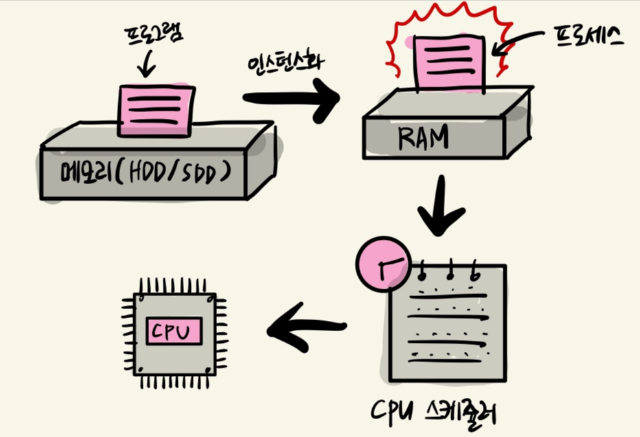 위의 그림처럼, 프로그램이 메모리에 올라가면 프로세스가 되는 인스턴스화가 일어나고, 이후 운영체제의 CPU 스케줄러에 따라 CPU가 프로세스를 실행한다.