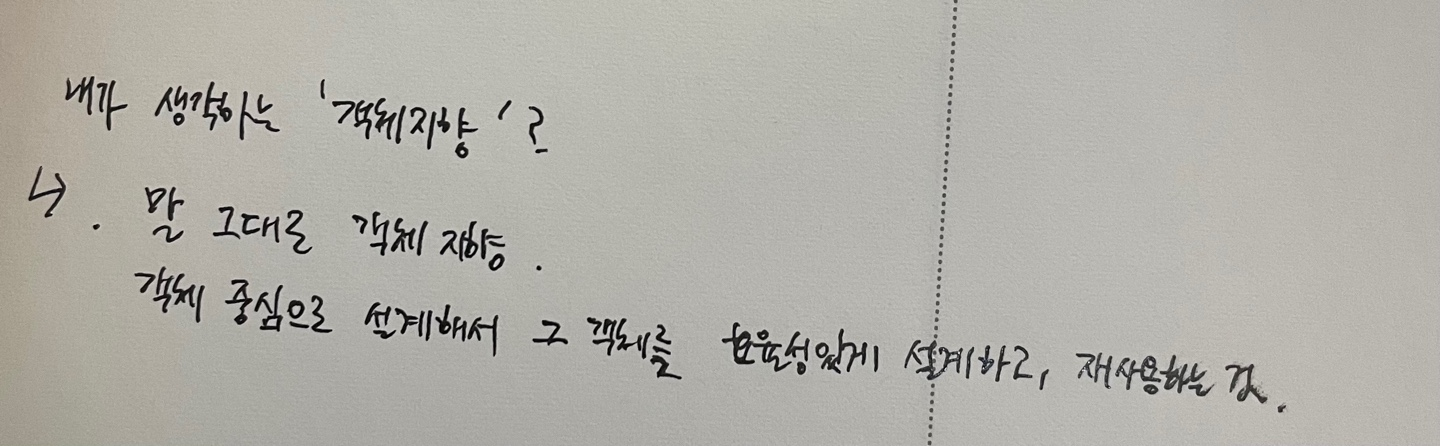 먼저 이 책을 본격적으로 읽기 전에, 내 스스로 내가 생각하는 '객체지향'이 뭔가? 에 대해서 생각해보는 시간을 가졌다. 자바의 정석을 그렇게 봤음에도 저 질문을 떠올리자마자 어버버하며 명쾌하게 한 문장으로 정리할 수가 없었다. (부끄러웠다)
