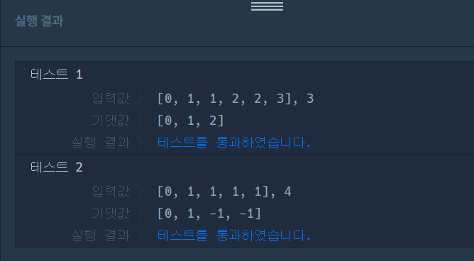 ?????????? 결과에서 싹 다 실패가 떠버린다. 이유를 찬찬히 고민해보니 answer = list(set(arr))[:k] 이 부분에서, set은 중복을 제거해주지만 순서를 보장하지 않기 때문에 싹 다 실패가 뜨는 것 같다고 추측했다.