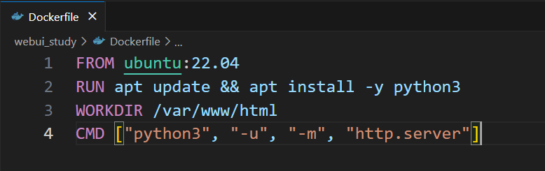 컨테이너 안에 파이썬3를 설치해서 파이썬3 안에 내장되어 있는 웹 서버를 사용할 거다. 이를 위한 터미널 명령어는 아래와 같은데,