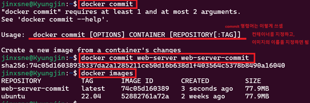 web-server라는 이름을 가진 컨테이너에서, web-server-commit (commit을 통해 만들었다는 의미로 이렇게 지었다)라는 이름의 이미지를 만들어줘 라는 의미의 명령어다.