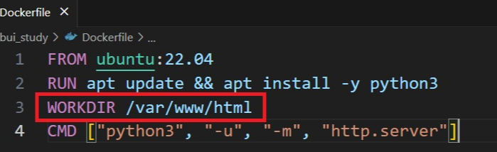 - 도커파일 뒤에 오는 모든 지시자(RUN, CMD, COPY, ADD 등)에 대한 작업 디렉토리를 설정