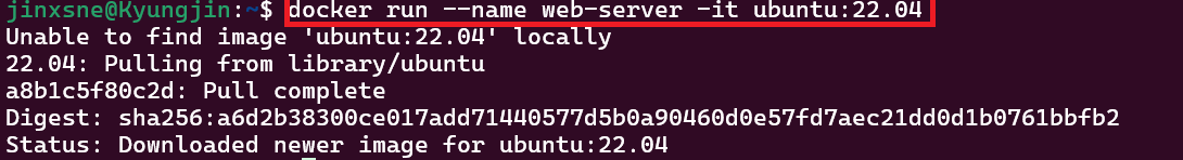 Ubuntu 22.04 라는 이미지를 web-server 라는 이름을 가지도록 한 명령어를 실행시켜주었다.