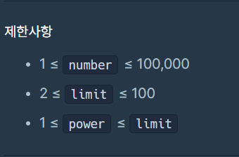 제한사항으로 number의 범위가 1 <= number <= 100,000 인데, 이것까지 생각을 못해서 모든 수의 약수를 구하는 과정에서 시간 초과가 나는 것 같았다.