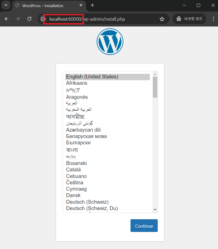 짜잔! 명시해 둔 60000번 포트 번호로 접속해주니, wordpress 처음 실행 시 나오는 설정 페이지가 잘 나타나는 것을 확인할 수 있다.