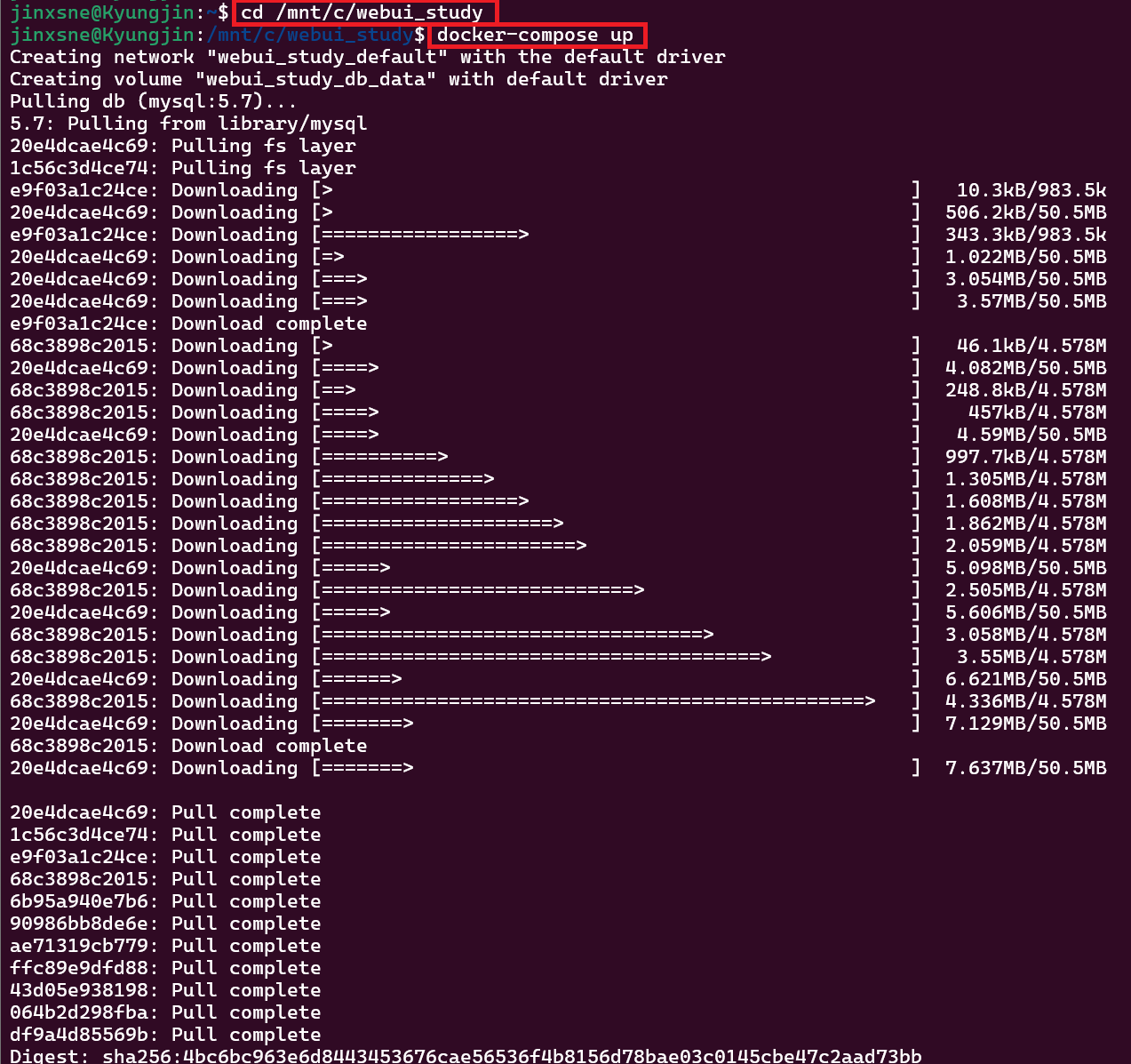 내 docker-compose.yml 파일이 webui_study 파일 아래에 있었기 때문에, 우분투 환경에서 C:\webui_study 디렉토리로 접근하기 위해 경로를 WSL 형식으로 변환해주고 해당 디렉토리로 이동하는 명령어를 입력해줬다. (따라서 실습 환경에 따라 이 명령어는 알맞게 변경하거나 입력하지 않아도 무방함)