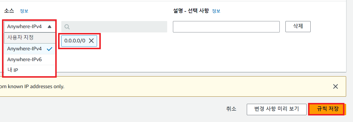 3-4. 소스 > Anywhere ~ 클릭해서 0.0.0.0/0, ::/0 생성 확인 후 '규칙 저장' 클릭하면 RDS 포트 열어주기 끝!