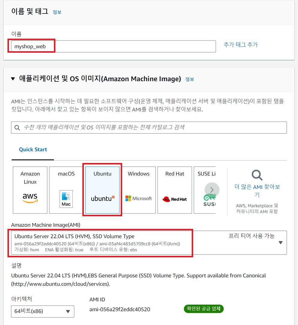 이름 및 태그는 선택사항이므로 원하는 이름으로 해주고, Ubuntu로 20.04 or 22.04를 선택해준다! (ubuntu 선택 중요!)