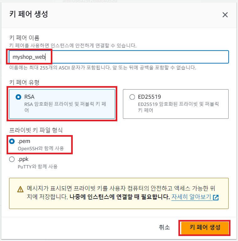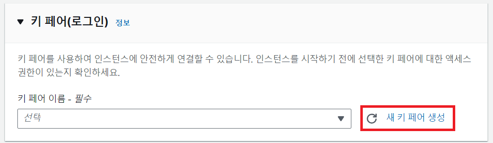 인스턴스 유형 메뉴의 바로 하단 키 페어 메뉴에서 '새 키 페어 생성' 클릭 후, key를 발급 받자. 발급받은 키는 서버 접속 시 매우 중요하므로 가지고 있어야 하는 점 주의!!!!