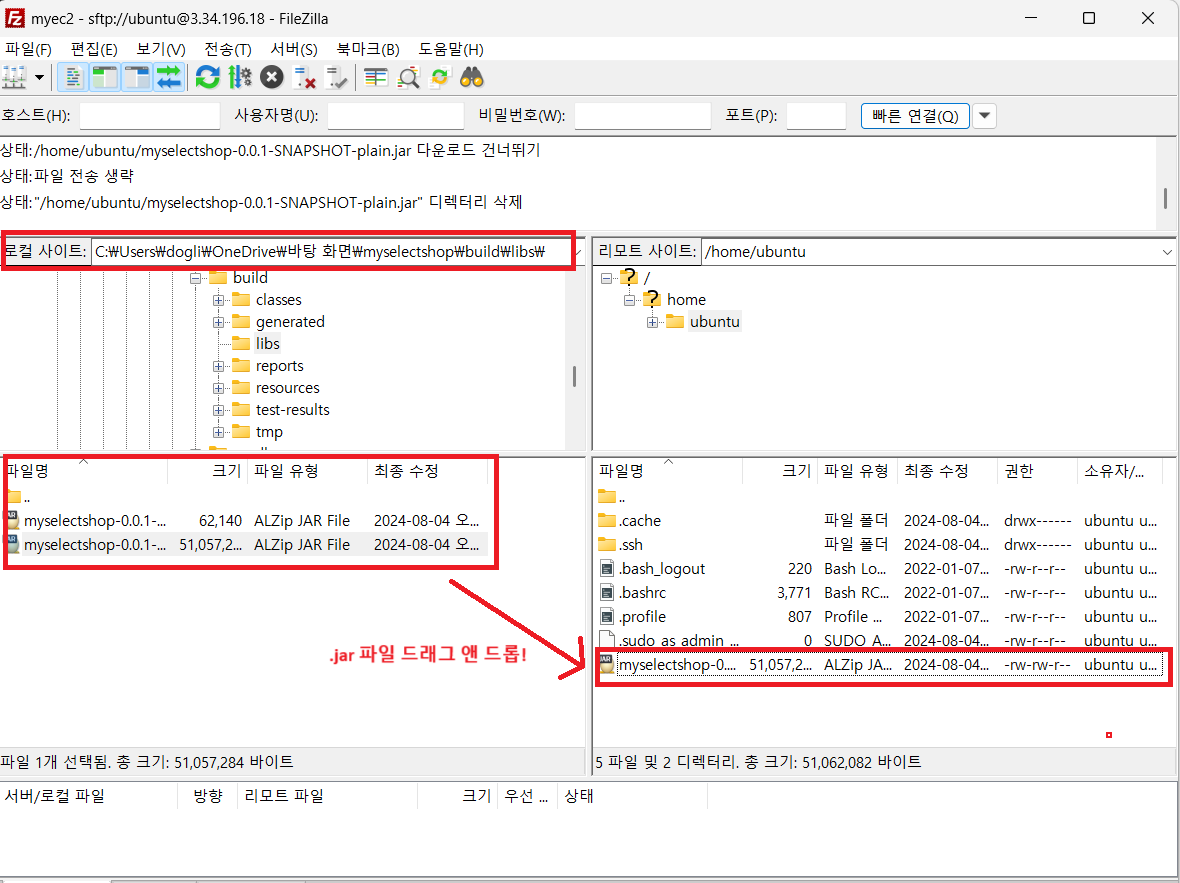 프로젝트이름-어쩌고-SNAPSHOT.jar 파일을 드래그해서 오른쪽 부분(EC2)에 드랍하면 끝!