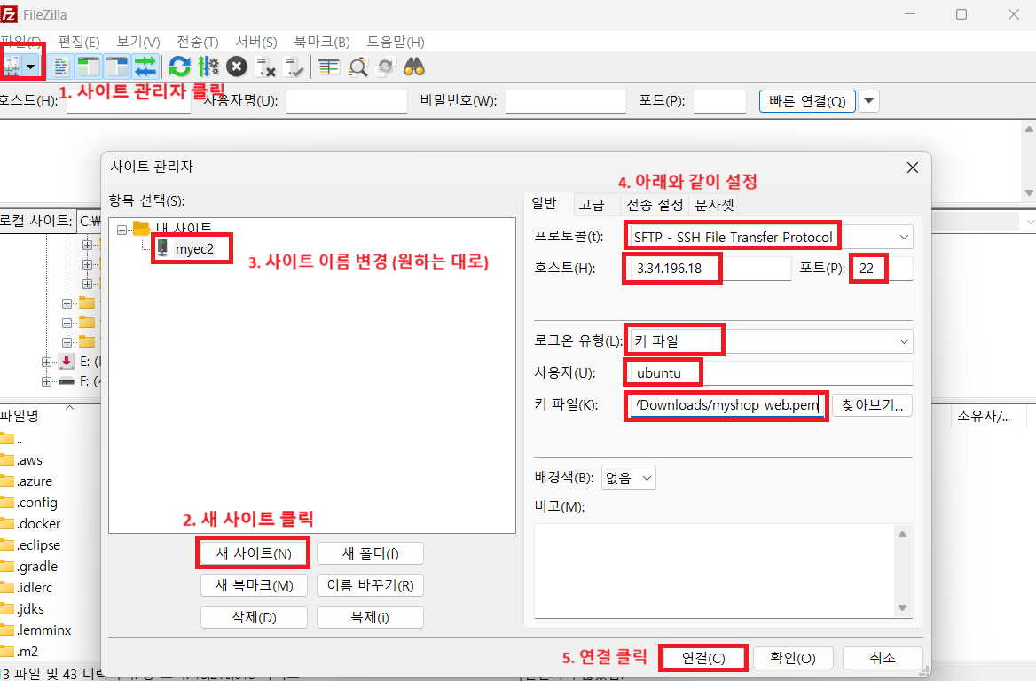 위 캡쳐본의 순서대로 클릭 및 설정해주면, (호스트는 아까 확인했던 EC2 서버의 IP값) 서버의 파일들을 볼 수 있다.