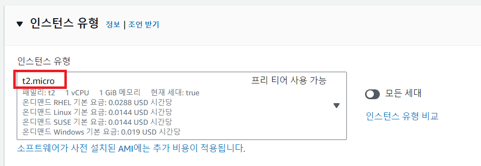 1-4. 인스턴스 유형으로 무료 버전인 t2.micro를 설정해준다. (1년 기한)