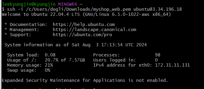 ssh -i 받은키페어를끌어다놓기 ubuntu@AWS에적힌내아이피