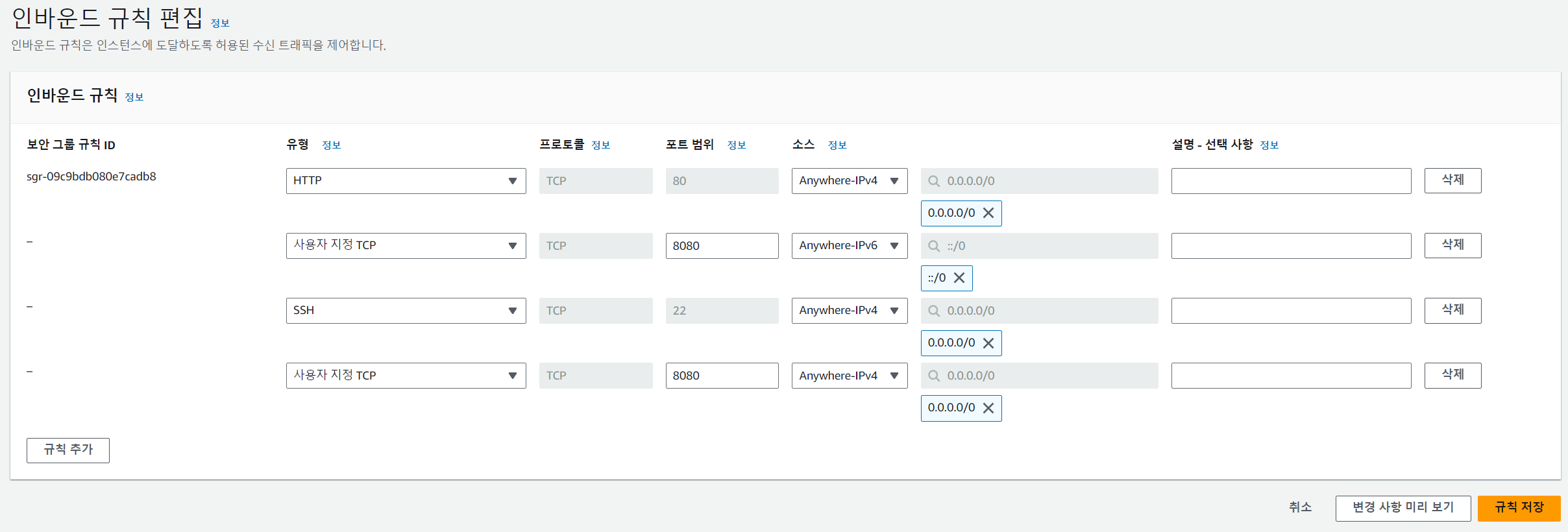 6-2. '인바운드 규칙 편집' 클릭 > 두 가지 포트번호 추가 (80, 8080)