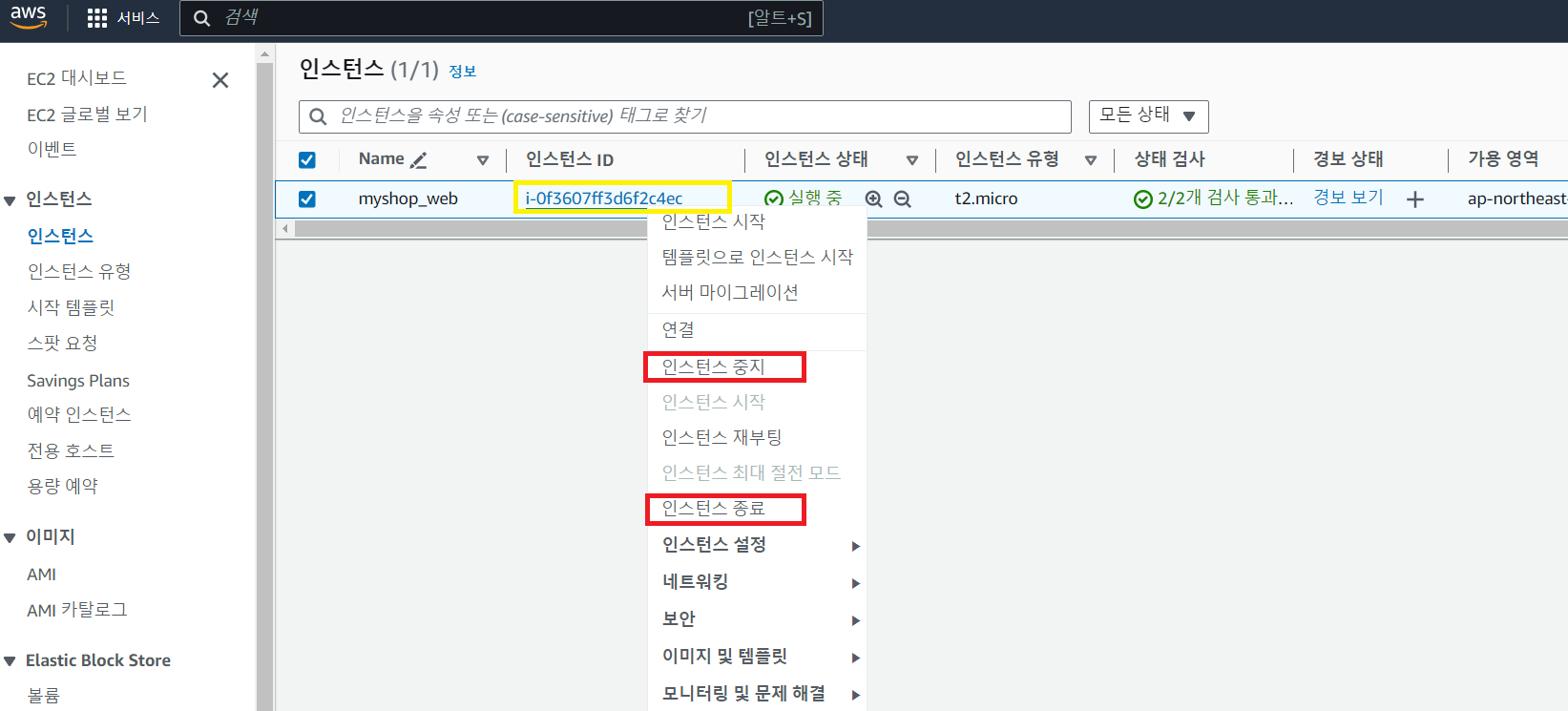 3. 인스턴스 중지 혹은 인스턴스 종료를 클릭한다.