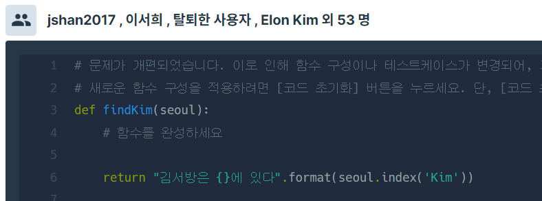 위 코드 중 seoul.index('Kim')은 리스트 seoul에서 'Kim'이라는 값이 처음 나타나는 위치를 반환한다. 1차 풀이에서 for문으로 푼 코드보다 훨-씬 간결해졌고 가독성도 좋다 ..