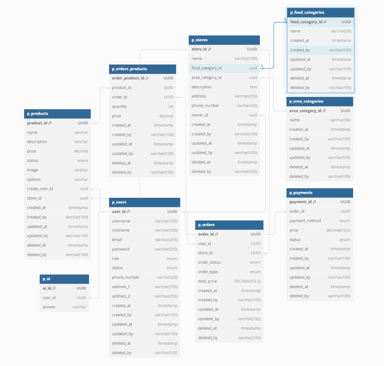 주문 테이블과 상품 테이블은 N:M의 관계를 가지게 되므로, 두 테이블 간의 매핑 테이블(p_orders_products)를 만들어두었다. 또한 AI를 통해 상품 이름을 추천받을 수 있어야 하고, 결과물을 DB에 저장해야 하기 때문에 AI 관련 테이블도 만들었다.