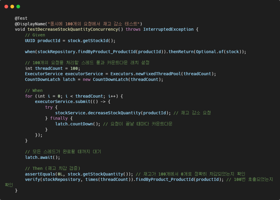 동시에 100개의 요청이 들어올 때의 테스트 코드를 작성하고 돌려보니 역시나 실패다.