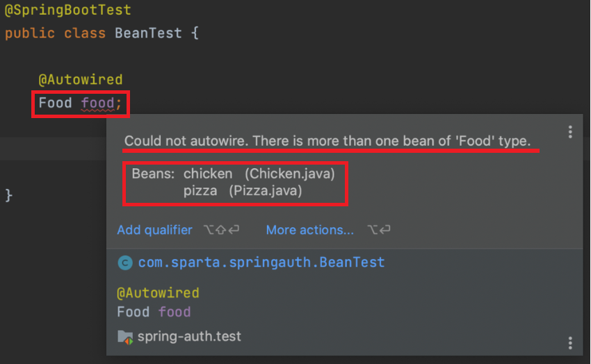 오늘은, Spring 환경에서 같은 타입으로 등록된 Bean이 2개 이상일 때 발생할 수 있는 문제를 알아보고 어떻게 해결할 수 있을지까지 학습해보도록 하겠다 😀 환경food 라는 패키지 아래에 클래스 세 개가 있다. Food라는 인터페이스에, 이 인터페이스를 구현하는 클래스 Chicken과 Pizza가 있는 구조이다. 1. Food 인터페이스package com.study.springauth.food;public interface Food { void eat();} 2. Food를 구현하는 Chicken과 Pizza 클래스여기선 @Component 애너테이션을 사용해서 Bean으로 등록하고 있다.package com.study.springauth.food;import org.springframe..