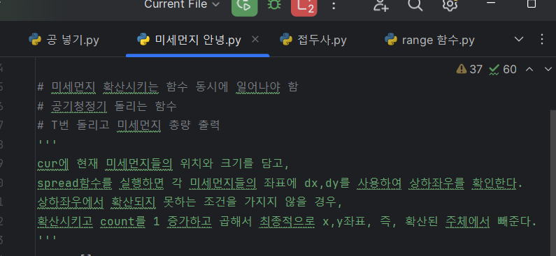 알고리즘 문제를 풀 땐 파이참으로 푸는데, 문제를 다 풀고 학습차원에서 주석을 달아주다가 문득 밑줄이 거슬리기 시작했다.커서를 댔을 때 팝업창 내용을 보니, 스펠링 체크 용이라서 밑줄이 없어도 개발에는 전혀 문제가 없다.그러니 당장 해제해보자 ㅋ.ㅋ 1. 왼쪽 상단에서 File > Settings 클릭 (밑줄에다 커서 대고 alt + enter 눌러도 된다) 2. Settings에서 Editor > Inspections > Proofreading > Typo 체크 해제 > OK 클릭 이제 스펠링 체크가 해제돼서 밑줄이 깔꼼하게 사라진 걸 볼 수 있다 😎 야호